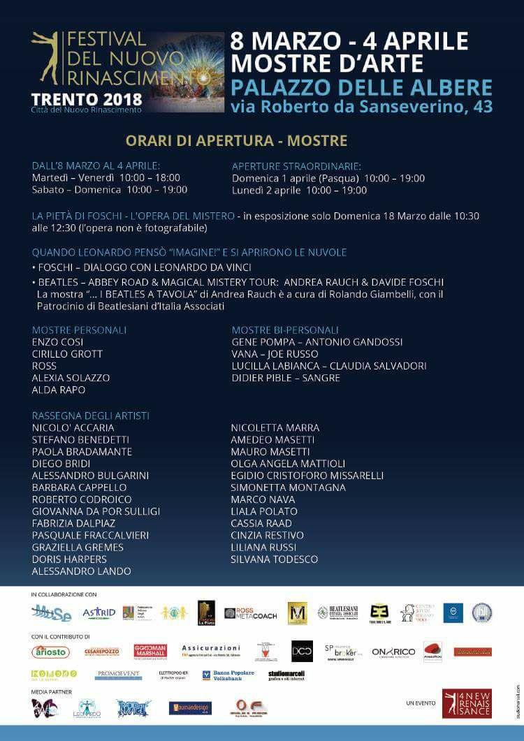 Da questa terza edizione in particolare il Festival del Nuovo Rinascimento si prepara ad un tour culturale che proseguirà fino alle edizioni del 2019, anno dedicato ad importanti anniversari che coinvolgono personaggi storici cari al Nuovo Rinascimento come Leonardo da Vinci e i Beatles, a cui sono dedicati gli eventi importanti racchiusi dal titolo evocativo: “Quando Leonardo pensò imagine! E si aprirono le nuvole…” che comprendono la mostra dello stesso Foschi iniziata a Trento nell’area archeologica di Palazzo Lodron, intitolata “Foschi: dialogo con Leonardo da Vinci” che comprende molte delle opere e degli studi dell’artista dedicati all’Ultima Cena e “Beatles – Abbey Road & Magical Mistery Tour”, con alcuni lavori di Foschi e una serie di tavole della serie “I Beatles a tavola” di Andrea Rauch, a cura di Rolando Giambelli e con il Patrocinio di Beatlesiani d’Italia Associati.