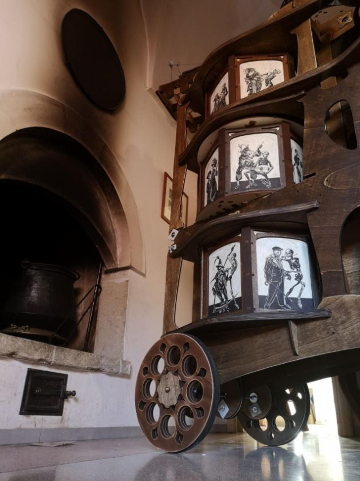 Poggiante su quattro ruote, si compone di tre cilindri illustrati che, al giro di una manovella, iniziano a ruotare accompagnati da un suono melodico mostrando le creazioni di Andrea De Simeis, diciotto incisioni ispirate alle più celebri danze macabre europee: da quella realizzata per il Cimitero degli Innocenti di Parigi alle pieces di Guy Marchant, dalle xilografie di Hans Holbein alle silhouettes di Melchior Grossek fino agli irriverenti scheletri del messicano José Posada.