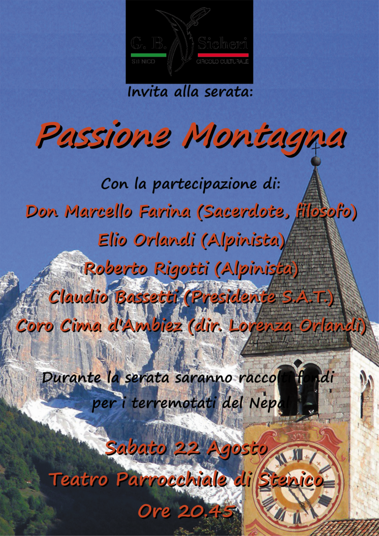 Il Circolo Culturale G.B. Sicheri è lieto di invitare alla serata “Passione Montagna” che si terrà sabato 22 Agosto alle ore 20.45 presso il Teatro Parrocchiale di Stenico.