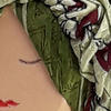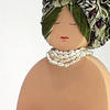 Roberta Cadorin trasforma la macchinina in una donna. Una donna dall’aspetto ricercato, sontuoso ma anche pensierosa, riflessiva. I pensieri sembrano avvolgerla come il turbante che la caratterizza. Sembra serena, seppur non accenna a volgere lo sguardo al mondo. È concentrata sul proprio essere. Il rossetto, la collana di perle, il corpo perfetto la presentano in tutta la sua bellezza. È una donna “mobile”, “qual piuma al vento”: così la presenta Roberta e in effetti il tessuto del foulard che ne incornicia il viso risente delle correnti circostanti. È sola ma questo non sembra preoccuparla, forse un po’ impensierirla.