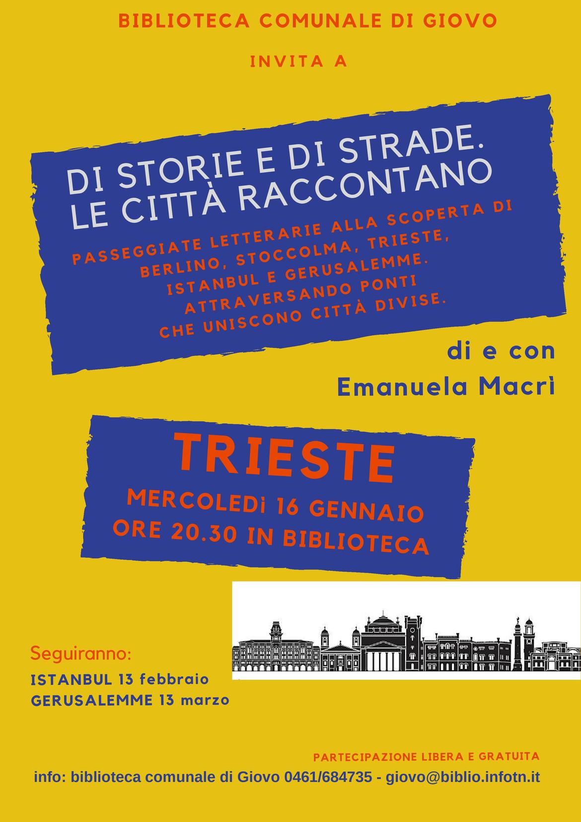 Si tratta di cinque incontri dedicati a cinque città: Berlino, Stoccolma, Trieste, Istanbul e Gerusalemme. In ogni serata la curatrice – Emanuela Macrì – conduce in una passeggiata alla scoperta del luogo attraverso cenni storici, riferimenti letterari, cinematografici, musicali, aneddoti... Il filo conduttore è il fatto che le città considerate hanno una storia di divisione.