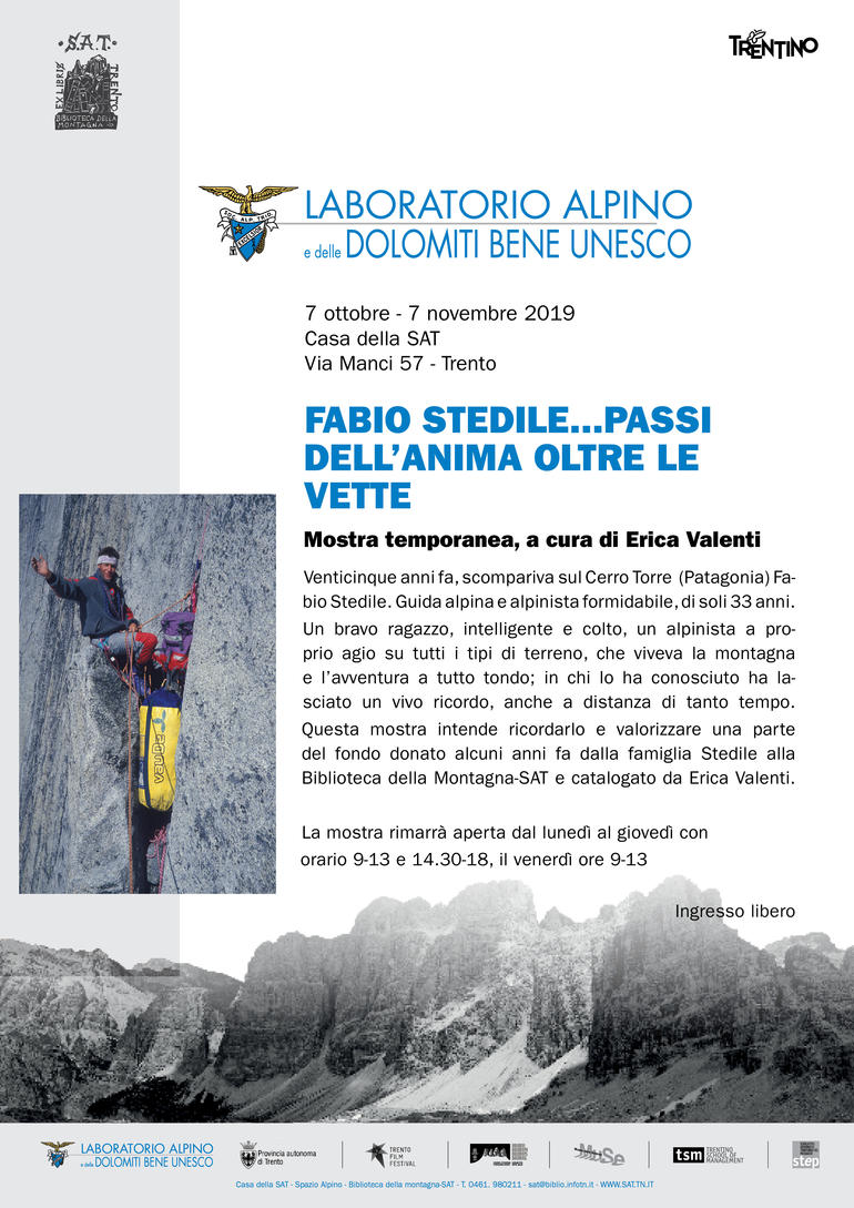Il 28 ottobre 1994 perdeva la vita sul Cerro Torre, nella Patagonia argentina, Fabio Stedile, alpinista trentino di fama, non solo nella nostra regione. Conosciuto ed apprezzato per la sua attività alpinistica che lo aveva portato sulle montagne di tutto il mondo, Fabio aveva ottenuto prestigiosi successi sia su roccia che sulle alte vette, senza escludere ottime prestazioni in altre attività come lo scialpinismo e il parapendio. Giovanissima Guida alpina a 21 anni, a 24 era stato il più giovane alpinista italiano a raggiungere una cima di ottomila metri, il Makalù. Aveva iniziato a dare un’impronta innovativa al modo di intendere i rapporti fra i professionisti della montagna e i cittadini, puntando soprattutto sui giovani con vari programmi a loro dedicati. Dotato di ottima capacità di intrattenimento ed esposizione, la sua presenza in trasmissioni televisive, anche nazionali, o le conferenze, richiamava un folto pubblico ed in molti oggi lo ricordano con nostalgia ed affetto. Alcuni anni fa la famiglia Stedile ha donato alla Biblioteca della Montagna-SAT l’intero archivio di Fabio, che ora è custodito presso l’Archivio storico SAT. Erica Valenti nel corso di quasi tre anni di lavoro volontario ha scansionato e ordinato tutte le immagini e le carte. Terminato questo lavoro ha curato la mostra temporanea intitolata “Fabio Stedile: passi dell’anima oltre le vette…”, che si terrà a Trento, presso la Casa della SAT (via Manci 57), dal 7 ottobre al 7 novembre, con ingresso libero. La SAT e la sua Biblioteca della Montagna ricordano così, nella ricorrenza del 25° anniversario dalla morte, questo grande alpinista e contemporaneamente fanno opera di restituzione al pubblico di parte dell’archivio.