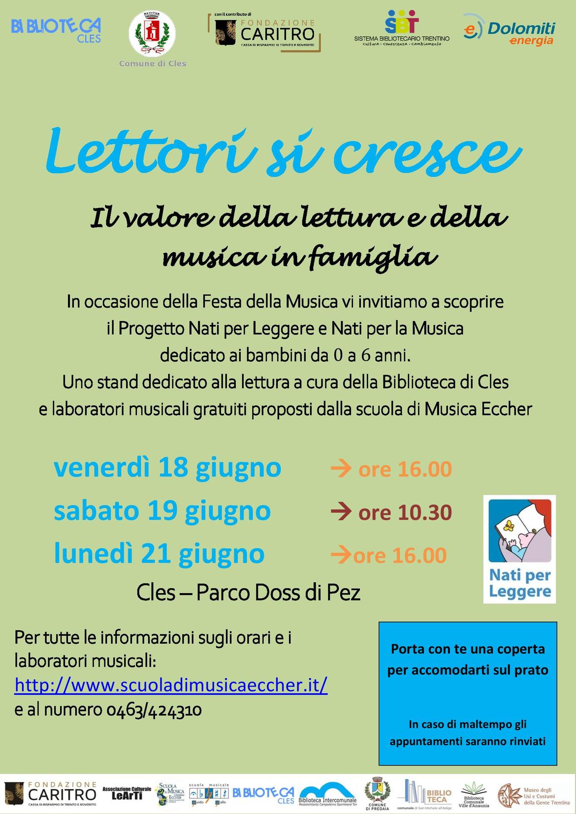 In occasione della Festa della Musica vi invitiamo a scoprire il Progetto Nati per Leggere e Nati per la Musica dedicato ai bambini da 0 a 6 anni. Uno stand dedicato alla lettura a cura della Biblioteca di Cles e laboratori musicali gratuiti proposti dalla scuola di Musica Eccher.