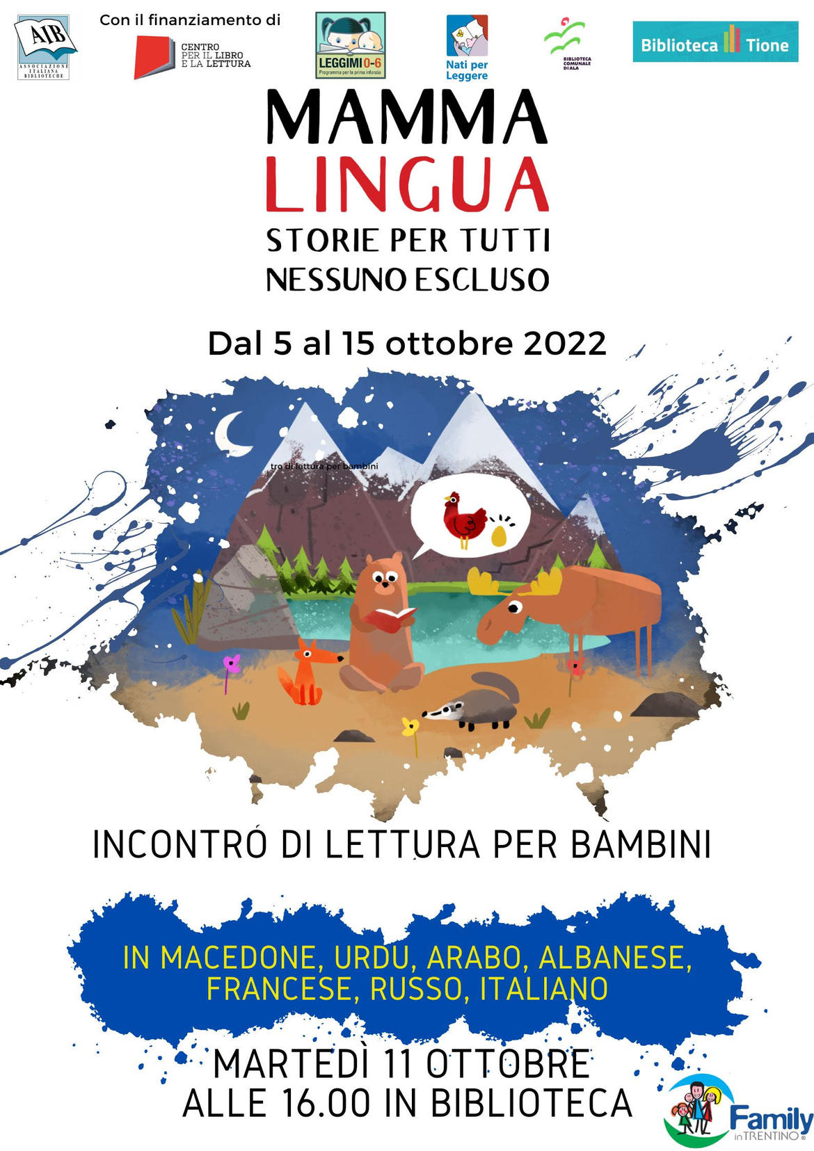 Dal 5 al 15 ottobre ospitiamo la valigia di libri itinerante messa a disposizione dalla biblioteca di Ala, presidio trentino per Mamma lingua. Ogni bambino dovrebbe ricevere nutrimento dalle parole della propria lingua d'origine.