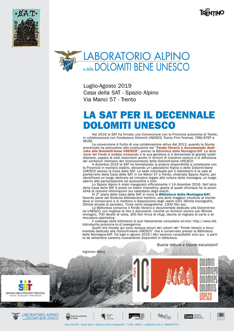 Per ricordare il decennale dell'inserimento delle Dolomiti nella lista UNESCO del Patrimonio dell'umanità, la SAT e la sua Biblioteca della Montagna, allestiscono questa esposizione bibliografica a tema Dolomiti.