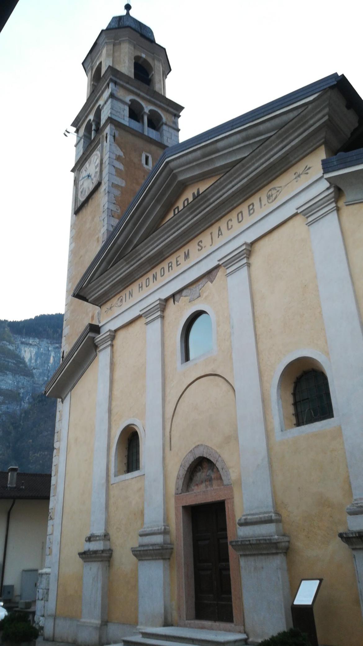 All’interno, nella parte tardo-gotica, la più pregevole della chiesa dal punto di vista stilistico e architettonico, vi sono, distribuiti un po’ ovunque, preziosi brani di affreschi quattro-cinquecenteschi riferibili a diverse mani. L’affresco del pilastro di destra, scoperto recentemente e raffigurante forse una Scena di esorcismo (San Giacomo converte il Mago Ermogene scacciandone il demonio ?), potrebbe appartenere ad un pittore di ambito trentino-atesino, operante nella seconda metà del XV secolo. Attribuibili stilisticamente a un pittore veneto di ambito montagnesco, attivo ai primi decenni del XVI secolo, sono gli affreschi dell’altare in cornu epistolae con il Trono di Grazia e i Santi Nicola, Giovanni Battista, Sebastiano e Lucia nonché quelli dell’arco santo con i Busti dei dodici Apostoli. A un pittore locale, operante nella terza e quarta decade del XVI secolo, conosciuto come il “Secondo Maestro della Valsugana”. Andrebbero assegnati i dipinti della controfacciata con il Giudizio Universale, dell’altare in cornu evangelii con la Madonna Assunta e le Sante Giuliana di Nicomedia e Apollonia e quello del pilastro sinistro con Sant’Anna Metterza.